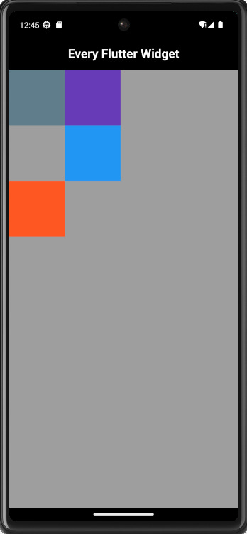 The FractionalTranslation widget translates its child's painting. In the example below, even though the second Container is in a Column, because it is wrapped with the FractionalTranslation widget, we can change the position instead of it being stacked vertically. We pass an Offset widget to the translation to define the position we want the child to be in. Keep in mind that the Container still takes up its original space vertically so if we were to put a third widget or Container we’d still see the space there.